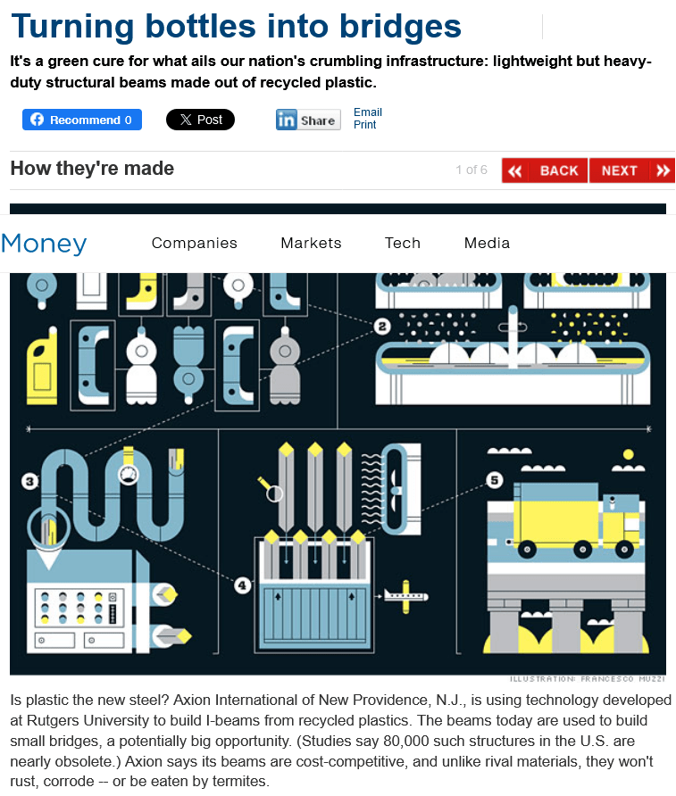 There’s a company called Axion International that had invented a process to transform recycled plastic bottles into the equivalent of steel beams. This line is on its website: